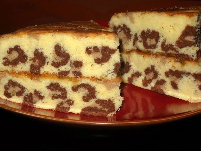 Puneți forma în cuptorul preîncălzit la 180 de grade și coaceți timp de 40 de minute. Mai bine să coaceți 2 blaturi și să le așezați unul deasupra celuilalt, astfel checul va arăta mai bogat și imprimeul de leopard va fi mai expresiv.