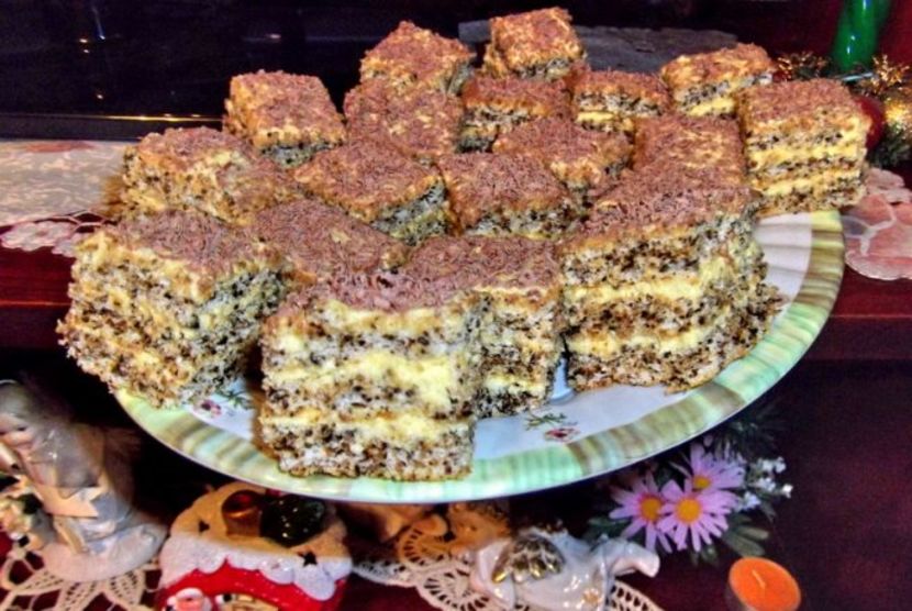 Sunt 3 foi care se coc individual. Ingredientele pentru o foaie: 3 albusuri 3 linguri de zahar 2 linguri de faina 1 lingurita de bicarbonat de sodiu stins cu zeama de lamaie 5 linguri de nuca macinata Crema: 9 galbenusuri 200 g zahar pudra 200 g unt esenta de vanilie Decor: ciocolata rasa