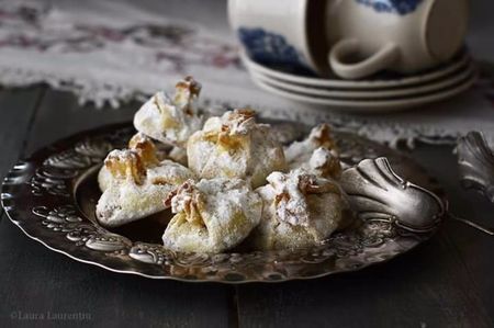 Ca să fac aceste minunate fursecuri, am cântărit 200 de grame de făină într-un castron încăpător, am adăugat un praf de sare și 1 plic de zahăr vanilat. Am omogenizat cele adăugate cu făina și am pus în castron 100 de grame de unt gras, tăiat cubulețe. Cu vârful degetelor, am încorporat untul în făină, până ce a căpătat un aspect omogen, nisipos. Am adăugat apoi 3 gălbenușuri proaspete și 1 lingură cu vârf de smântână fermentată, nerușinat de grasă, să fie de peste 35% grăsime, dacă se poate. Amfrământat rapid un aluat omogen, fără a insista prea mult. Imediat după ce ingredientele s-au omogenizat și aluatul s-a legat, m-am oprit din frământat. Am împărțit aluatul în 36 de bucăți egale, fiecare modelată sub formă de bilă. Am așezat pe un platou bilele de aluat, le-am înfoliat și le-am dat la frigider pentru o oră. Imediat ce-am dat aluatul la frigider, am pregătit și umplura. E nevoie să fie făcută din timp, lăsând-o să se odihnească până ce se vor umple fursecurile, pentru ca bezeaua să se mai lase și să nu crape fursecurile în timpul coacerii. Pentru umplutură, am bătut cele 3 albușuri despărțite de gălbenușurile folosite pentru aluat cu o pișcătură de sare, într-un castron încăpător, până ce s-a format o spumă densă. Am adăugat 100 de grame de zahăr în ploaie, treptat, și-am bătut în continuare până ce am obținut o bezea densă, în care zahărul s-a dizolvat complet. Pentru bezea, am adăugat 200 de grame de nucă măcinată, coaja rasă (doar partea galbenă) de la 1/2 de lămâie și 50 de grame de stafide. Am omogenizat totul cu o spatulă apoi am acoperit castronul cu folie alimentară și am lăsat umplutura să se odihnească cele 45-50 de minute, până ce-am început umplerea fursecurilor. Cu aproximativ 15 minute înainte să scot aluatul din frigider, am pornit cuptorul și l-am fixat la 190°C. Am presărat planul de lucru cu făină, la fel și sucitorul. Rând pe rând, am lucrat cu câte o bilă de aluat. Fiecare bilă de aluat am întins-o aproximativ circular, cât mai subțire posibil. Nu contează dacă marginile sunt ușor zdrențuite, de fapt asta chiar va crea un efect plăcut, până la final. Din fiecare bilă trebuie să se obțină un disc cu grosimea de 1-2 mm și diametrul de 12-13 cm. Am pus câte o linguriță cu vârf de umplutură pe discul de aluat întins apoi am adunat marginile de jur împrejurul umpluturii, formând un pachețel. Pe măsură ce-am modelat fursecurile, le-am aranjat pe tăvi acoperite cu hârtie de copt și mi-au rezultat două astfel de tăvi. Tavile cu fursecuri fragede ”Sărutările Măicuțelor” se coc pe rând în cuptorul preîncins la 190°C, la o înălțime medie. Timpul de coacere recomandat este de 12-13 minute, până când fursecurile devin ușor aurii, rumenindu-se puțin la vârf. Imediat ce am dat fursecurile la copt, mi-am pregătit la îndemână un castron cu zahăr pudră vanilat. De îndată ce am scos fursecurile coapte din cuptor, le-am tăvălit prin zahărul pudră. E nevoie să facem asta acum, cât sunt fierbinți, altfel zahărul nu mai aderă bine de ele. Atenție, fursecurile vor fi extrem de fragile în această fază, trebuie să lucrăm cu atenție. Dupa ce se tăvălesc prin zahăr pudră vanilat, fursecurile se așează în tăvi, până se răcesc bine. Abia după ce sunt complet reci le vom servi.
