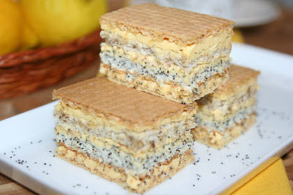 2 foi de napolitana (23*35 cm) Mod de preparare : Blat nuca : mixam spuma albusurile , adaugam apoi zaharul, mixand pana se topeste si bezeauea se intareste. La final adaugam faina amestecata cu nucile macinate. Rasturnam compozitia in forma de copt (23*35 cm) tapetata cu hartie de copt si coacem circa 10-15 minute. Blat mac : mixam spuma albusurile, adaugam apoi zaharul, iar la final faina amestecata cu macul. Rasturnam compozitia in tava tapetata cu hartie de copt si coacem.Crema : mixam spuma galbenusurile cu zaharul, adaugam apa, cate 1 lg pe rand, apoi punem pe aburi, amestecand mereu. Lasam crema sa se raceasca. Untul moale de la temperatura camerei il mixam spuma, iar in el adaugam cate 1 lg din crema racita . La final adaugam esenta de vanilie si coaja rasa de lamaie.Asamblare : foaie napolitana - 1/3 crema - blat mac - 1/3 crema - blat nuca - 1/3 crema - foaie napolitana. Foaia de napolitana o taiem exact dupa dimensiunile blaturilor, cu ajutorul unui cutit bine ascutit , iar coltuirle foilor le taiem.Peste foaia de napolitana sezam o greutate, pentru a se lipi bine napolitana de crema si dam la rece pentru cateva ore, apoi putem felia si servi. Se taie foarte usor si este o prajitura aspectuoasa si absolut delicioasa !!! :)