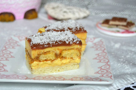 Blat : mixam spuma albusurile cu un praf de sare, pana se intaresc, apoi zaharul, mixand pana obtinem o bezea ferma. Adaugam rom-ul treptat, apoi faina cu praful de copt cernute, amestecand cu o lingura, cu miscari circulare. Coacem in tava (25*35 cm) tapetata cu hartie de copt, in cuptorul preincalzit, la 170 grade Celsius, circa 30 minute. Facem testul cu scobitoarea. Crema : galbenusurile le mixam cu zaharul, apoi cu praful de budinca, iar la urma cu laptele . Punem pe foc mediu , amestecand mereu pana se ingroasa. Acoperim cu folie alimentara si lasam crema sa se raceasca. Untul moale de la temperatura camerei il mixam putin, adaugam zaharul pudra , apoi cate o lingura din crema racita. Impartim in 2. O parte o amestecam cu cele 30 g cocos, iar o parte ramane simpla. Asamblare : blat- 1/2 crema vanilie cu cocos- piscoturi inmuiate in cafea espresso usor indulcita-1/2 crema vanilie- glazura de ciocolata (amestecam cele 3 ingrediente pe foc mic, pana la omogenizare). Dam prajitura la rece de seara pana dimineata sau pentru minim 4 ore, apoi feliem cu un cutit trecut prin apa fierbinte, sters de apa.