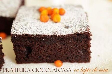 Mai intai incingem cuptorul la 180°C si tapetam cu hartie de copt o tava mare (35×40 cm). Batem albusurile spuma cu un praf de sare. Separat, frecam galbenusurile cu zaharul pana avem o crema ca o alifie, deschisa la culoare si in care zaharul nu se mai simte. Adaugam apoi untul moale, la temperatura camerei si amestecam bine cu mixerul la viteza mare. Adaugam apoi laptele se soia, amestecam din nou si punem faina, cacaua si praful de copt. Omogenizam si la final punem si albusurile batute spuma, de data asta insa nu mai amestecam cu mixerul, ca sa nu iasa aerul din compozitie. Amestecam cu spatula, cu miscari de sus in jos, pana spuma de albusuri e incorporata. Turnam compozitia in tava si nivelam cu spatula, apoi o coacem 20-25 de minute sau pana trece testul scobitorii. Este o prajitura foarte densa, nu foarte dulce si o puteti imbunatati cum vreti voi: cu nuci, alune de padure, fructe confiate etc. Dupa ce se raceste de tot, o pudram cu zahar vanilat si… ce bine merge si cu un glob de inghetata alaturi! Sa va fie de cel mai bine!