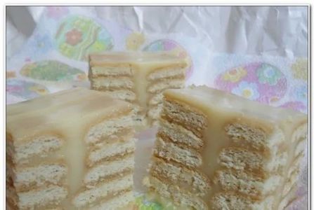 -cat inca este calda turnam budinca in strat subtire in tava tapetata cu folie alimentara, asezam un strat de biscuiti, turnam budinca. Alternam straturile de biscuite si budinca pana se temina. Acoperim cu folie si dam la rece pana se intareste complet .
