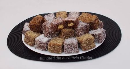 Luam fiecare dreptunghi de pandispan,il inmuiem in glazura calduta, apoi il tavalim prin nuca de cocos sau nuca macinata. Sunt absolut delicioase!