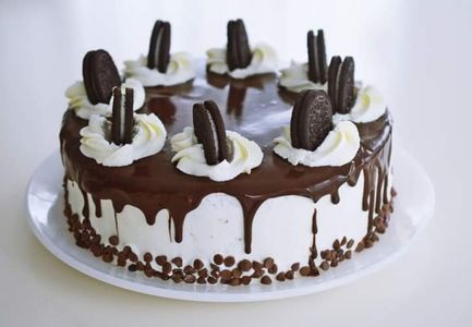 Topim pe baie de abur sau la foc mic, mic ingredientele, apoi lasam glazura sa se racoreasca. Cand este doar usor calduta o turnam usor pe mijlocul tortului, iar cu o spatula o distribuim uniform lasand sa se prelinga si pe laterale.Cand glazura e rece (dam la frigider 15 minute) spritam 8 aveline deasupra si punem usor peste fiecare cate un biscuit Oreo.La baza decoram fie cu pepite de ciocolata, fie cu bucatelele de biscuit ramase.